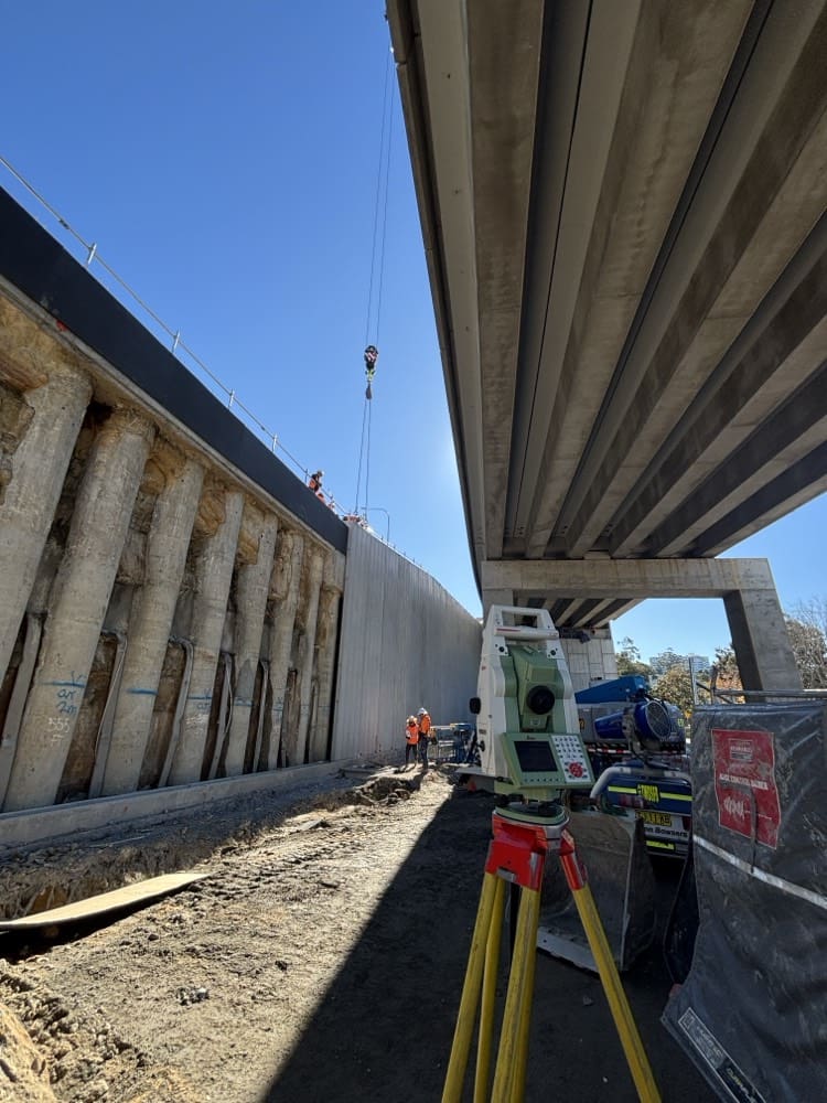 On a project of this complexity, where 250,000 vehicles pass through the work zone daily, survey accuracy isn’t just a quality requirement — it’s a safety imperative. Misalignment on a bridge bearing, a retaining wall footing, or a pavement tie-in within a live motorway corridor carries consequences that go well beyond rework.